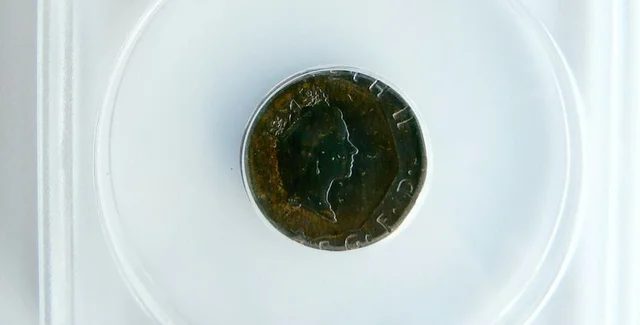 Эти 20 пенсов были созданы для заморских территорий Великобритании, а затем изъяты из обращения. Монета была отчеканена из омедненной стальной заготовки, но оказалась плохого качества. Из-за этой ошибки она была продана за 1400 фунтов стерлингов (чуть более 65 тысяч гривен) на аукционе Tennants Auctioneers в Харрогите, Северный Йорк.