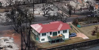 Дом с красной крышей Доры Этуотер Милликин и ее мужа Дадли Лонга Милликина III выделяется на фоне обломков и развалин в Лахайне. С момента появления снимков в интернете появились теории заговора, а некоторые недоумевающие пользователи социальных сетей восклицали "фотошоп" или "искусственный интеллект".