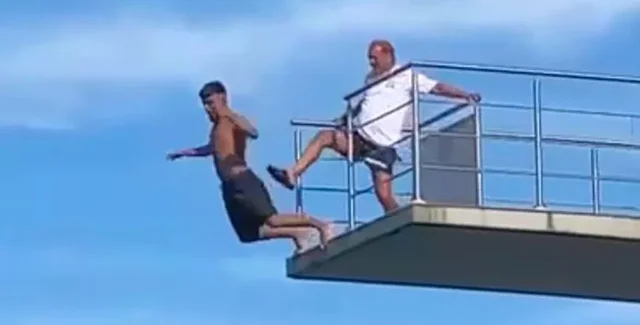 В Австрии мужчина забрался на вершину 10-метрового трамплина для прыжков в воду, но от страха не смог ни спрыгнуть, ни спуститься, и спасатель грубо столкнул его вниз. Об этом пишет Daily Star.
