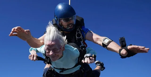 Еще когда ей было 100 лет, она совершила свой первый прыжок с парашютом.
