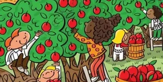 На картинке вы увидите изображение сада, где люди собирают яблоки с деревьев и складывают их в корзины. Задний план представляет собой коровник с коровой и курицей у двери, а также грузовик с яблоками, двигающийся по дороге.
