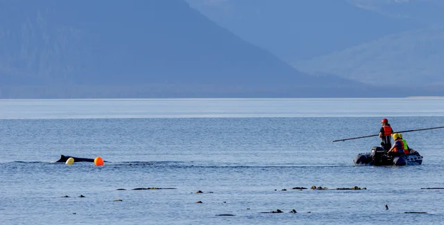 В результате удачного стечения обстоятельств нескольким спасателям удалось обнаружить кита и его буи, прилетев из Джуно (Аляска). Животное успело пройти около мили от места, где его заметили накануне.