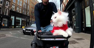 Шестилетняя кошка Сигрид обычно сопровождает своего владельца Нельсона во время поездок. На днях в Лондоне водитель мопеда врезался в руль взятого на прокат велосипеда.