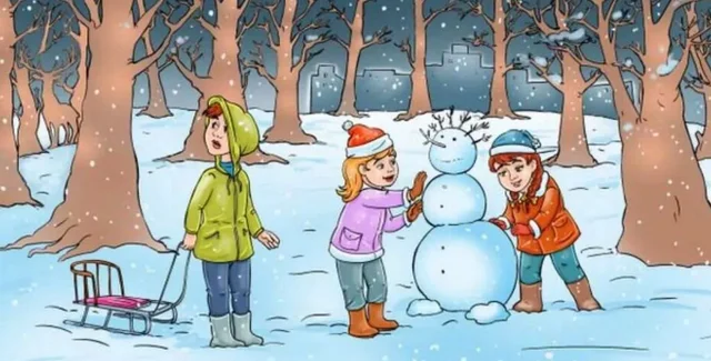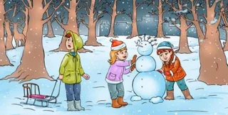 На картинке изображены трое веселых детей в зимнем лесу, играющих в снегу. Двое из них лепят снеговика, а другой держит санки. Их окружают несколько деревьев. Однако где-то рядом с ними притаилось животное.