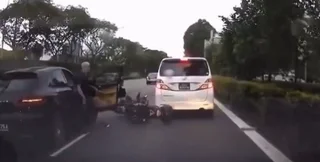 На видео показано, как водитель элитной машины медленно пытается перестроиться из одной полосы в другую, поворачивает налево, но неожиданно сталкивается с мотоциклом. Двухколесное транспортное средство переворачивается, а два человека (водитель и пассажир) разлетаются в разные стороны.