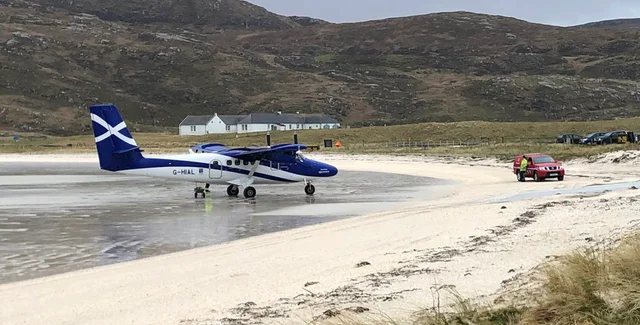 Аэропорт Барра на Внешних Гебридcких островах, в 40 милях (64 км) от побережья западной Шотландии, требует от пилотов следить за посетителями пляжа и пловцов рядом с берегом, когда они заходят на посадку на песок.