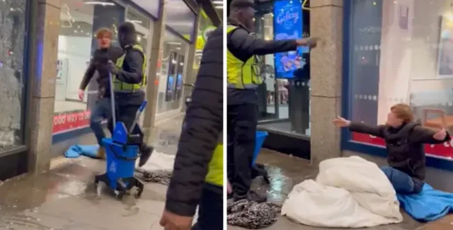 На ролике, снятом в зажиточном лондонском районе Белгравия, что неподалеку от Букингемского дворца, показано, как вода затекает под спальный мешок и одеяло бездомного. Охранник подбрасывает ногой его постель, а мужчина кричит вдогонку: "Оставьте меня".