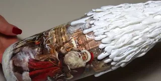 Если вы не умеете рисовать, вам поможет техника декупажа. Для этого понадобится красивая бумажная салфетка с новогодним рисунком. В преддверии праздников продается огромное количество вариантов таких салфеток, и вы точно найдете тот, который понравится. Для создания такого декора вам понадобится: