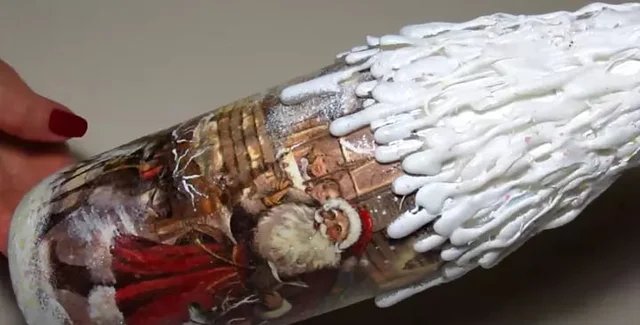 - Клеевым пистолетом сделайте потеки на бутылке, имитирующие сосульки. Начинайте делать их от границы рисунка по кругу и двигайтесь вверх к пробке.