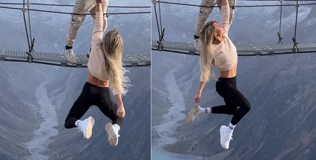 Блогер Саймон Бруннер, участник конкурса Ninja Warrior, показал в своем Instagram видео с жутким трюком. В кадре он одной рукой держит инфлюенсерку Пию Нидермайер, якобы повисшей на веревочном мосту в австрийских горах.