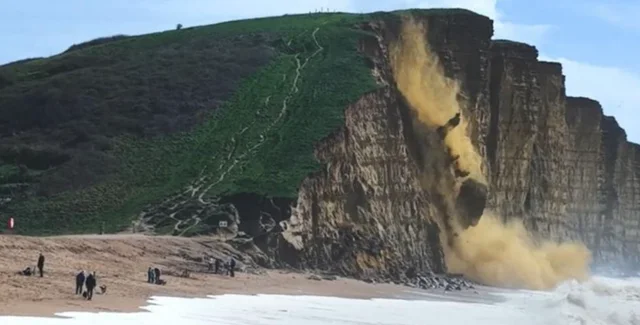На пляже Вест-Бей в графстве Дорсет (Великобритания) на глазах у туристов в море обвалилась огромная скала. Жуткий момент удалось записать на видео с помощью дрона одному из очевидцев — Омару Эль-Хаджему, пишет издание Metro.