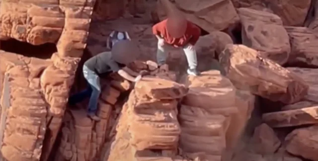"Папочка, не упади": двое мужчин с ребенком разрушали древнюю скалу, сбрасывая с нее валуны