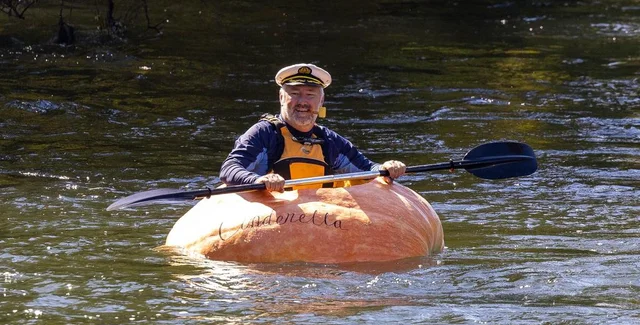 Мужчина вынул мякоть и семена из тыквы, превратив ее в настоящее каноэ под названием "Золушка", на котором преодолел милю вниз по течению реки Тумут (Новый Южный Уэльс), привлекая внимание около тысячи зрителей, которые с восторгом наблюдали за его путешествием.