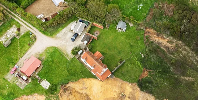 Постройка 18 века оказалась в опасном положении. Старый дом с тремя спальнями был куплен на аукционе пять лет назад за 132 000 фунтов стерлингов. Сейчас его можно увидеть свисающим с края утеса. Новые фотографии показывают масштабы береговой эрозии, которая за прошедшие годы значительно усилилась. Раньше фермерский дом располагался гораздо дальше от обрыва, а в результате недавних оползней задняя часть дома оказалась над пропастью.