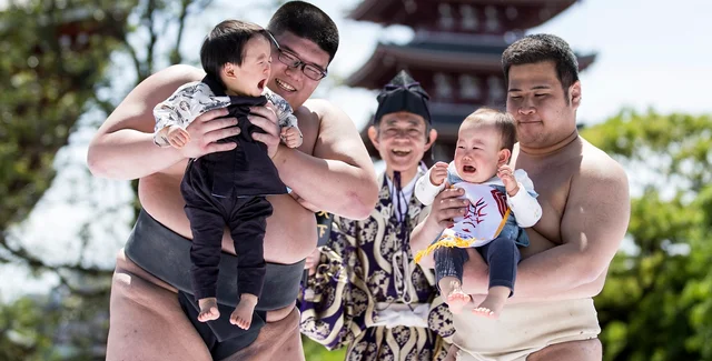 В эти выходные (28 апреля) в Японии прошел ежегодный фестиваль плачущих младенцев Накидзумо (дословно — "плачущее сумо"). Считается, что плач малышей отгоняет злых духов и приносит удачу. Так что уже 400 лет, раз в год, священнослужители в масках демонов пытаются заставить плакать младенцев, которых держат борцы сумо. Победителем обычно становится первый зарыдавший малыш. Об этом пишет Daily Mail.