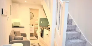 Гостиная настолько компактна, что тот, кто сидит на диване, может ногами закрыть дверцу стиральной машины напротив. На мини-кухне, находящейся под лестницей, есть раковина, духовка, стиральная машина и шкаф для микроволновой печи. Совсем рядом — санузел с туалетом, раковиной и душевой кабиной. Спальня наверху достаточно большая, чтобы там поставить двуспальную кровать.