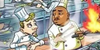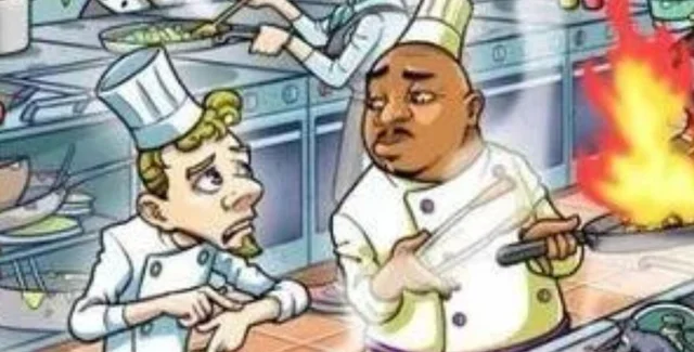 Несколько поваров суетятся над кастрюлями и сковородками, полными еды. На изображении также есть несколько необычных дополнений, чтобы отвлечь зрителя. Например, кошка, пытающаяся цапнуть официанта или мышь, сидящая на колпаке одного из поваров.