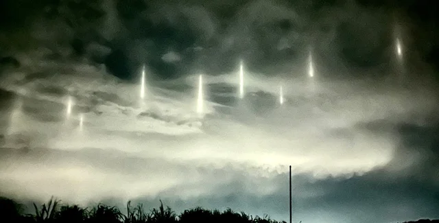 Девять "загадочных" столбов света появились в ночном небе над прибрежным поселком (фото)