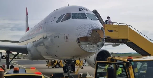 Самолет Airbus A320, принадлежащий австрийской авиакомпании Austrian Airlines, выполнял рейс из Майорки в Вену, когда попал под сильный град. Осадки пробили лобовое стекло и разрушили носовую часть самолета. Инцидент произошел в воскресенье, 9 июня. Об этом сообщила австрийская газета Kronen Zeitung.