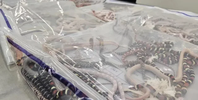 "Офицеры открыли мешки и обнаружили, что каждый мешок содержал несколько живых змей разной формы и цвета. После подсчета было найдено 104 змеи", — говорится в заявлении.