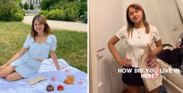 На записи можно увидеть двуспальную кровать, прижатую к стене, маленькую кухню и крошечную ванную комнату. Девушке пришлось творчески подойти к использованию пространства, в частности из-за нехватки места она использует кухонную стойку как письменный стол.
