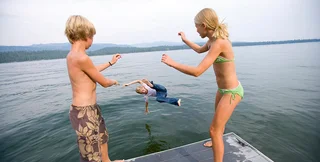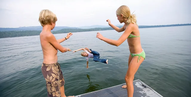 Видео начинается со сцены летних развлечений: дети в кадре веселятся и беззаботно купаются в водоеме. Далее их встревоженная мать показывает огромного осетра, который барахтается в воде.