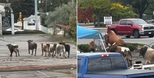 Животные промчались через заполненную автомобилями парковку рядом с торговым центром, снесли ограждение, разрушили палатку и направились в сторону оживленного шоссе.