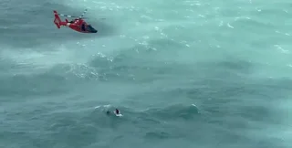 На видео, запечатлевшем кадры спасательной операции, видно как спасатель спускается на тросе с вертолета в воду и приближается к мужчине, который часами держался на плаву, держась за холодильник.