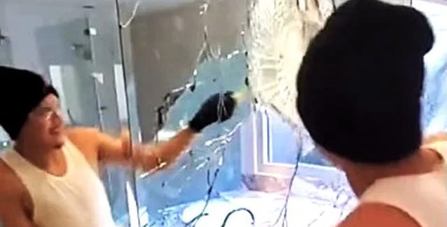 После этого он попросил своего помощника нанести повреждения ванной комнате. Мужчина начал крушить мраморные поверхности и стеклянные элементы кувалдой, превращая стильную ванную в руины.