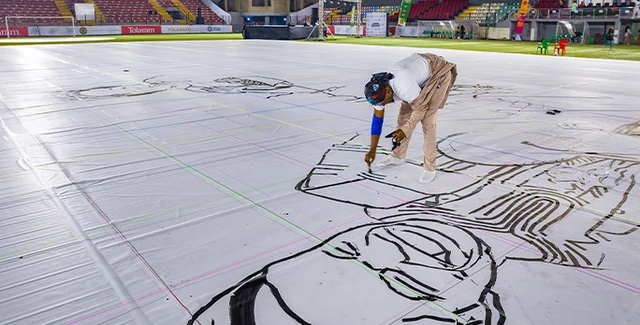 31-летний мужчина создал рисунок, используя водостойкие маркеры на огромном полотне на стадионе на 5000 мест в течение нескольких дней.