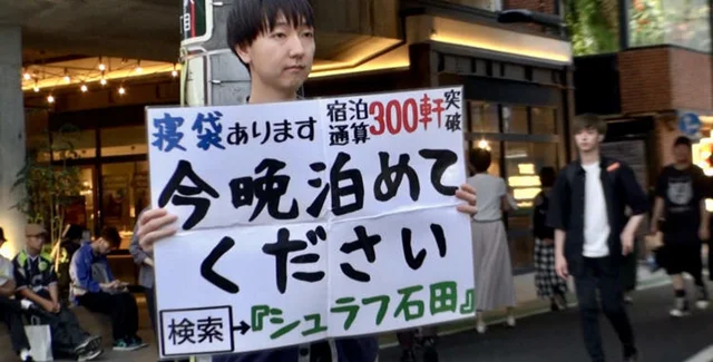 33-летний японец Шураф Ишида стал настоящей знаменитостью в соцсетях благодаря своему нестандартному подходу к обеспечению ночлега. За последние пять лет он переночевал более чем в 500 разных домах, используя табличку с просьбой пустить его переночевать. Об этом пишет Oddity Central.