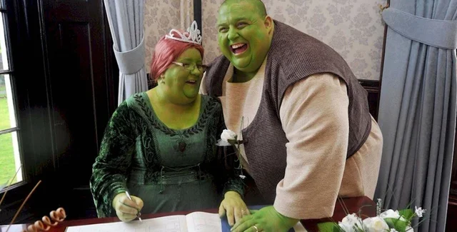 Молодожены Аманда и Нэйтан Гиббсы стали интернет-сенсацией, появившись на своей свадьбе раскрашенными в зеленый цвет, как главные герои культового мультфильма "Шрек". Их гости также придерживались дресс-кода, выбрав костюмы различных сказочных персонажей, в частности Пряничного Человечка, Джека Воробья из "Пиратов Карибского моря" и Мики Мауса. Об этом пишет издание The Mirror.