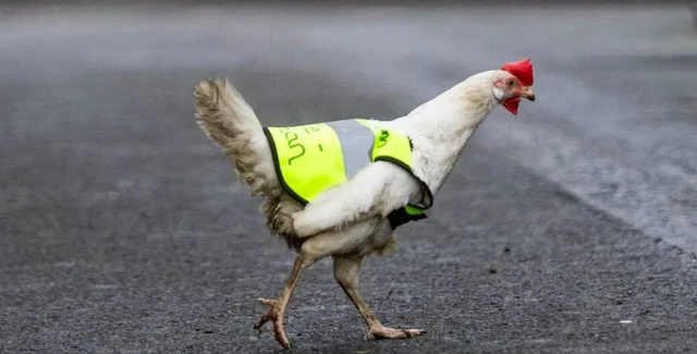 Курица любит бродить по улицам, и ее нервные хозяева решили, что было бы неплохо подарить ей ярко-желтый жилет, чтобы обезопасить ее во время перехода дорог.