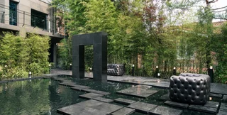 Интерьер Rain Report Cafe выдержан в минималистичном стиле, с преобладанием черных оттенков и окружен бамбуковыми деревьями, что усиливает ощущение уединения и природной гармонии. Панорамные окна позволяют гостям наблюдать за дождем, создавая впечатление, что они находятся за пределами шумного мегаполиса.