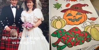 В забавном ролике Рид из Шотландии показано два изображения. На первом — свадебная фотография ее родителей, Кристин и Джона МакГаккинов, которые поженились именно в 28 лет. На втором — ее раскраска, отправленная маме, чтобы похвастаться.
