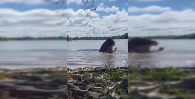На видео показано, как женщина, находящаяся в воде, пятилась к берегу спиной вперед, одновременно показывая палец, очевидно, таким образом предупреждая животное держаться подальше. Однако огромный травоядный грызун бросился на купальщицу и свалил ее с ног.