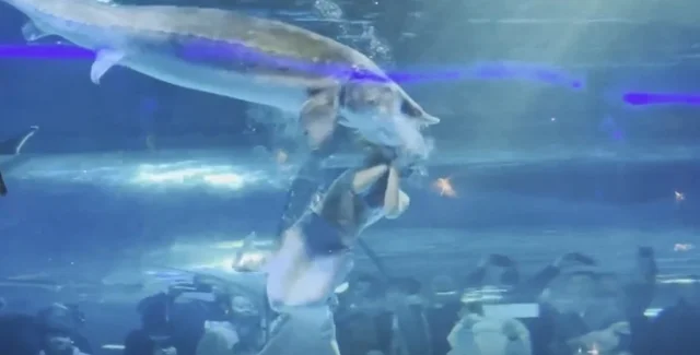 Зрители были в ужасе, когда рыба напала на девушку и вцепилась ей в лицо. На видео, которое появилось в соцсетях, видно, как аниматорша плавает в огромном аквариуме среди рыб. Но когда она медленно движется к поверхности, над ее головой появляется гигантское существо, напоминающее белугу, которое внезапно бросается на "русалку" и хватает ее за голову.