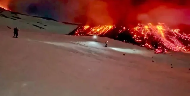 На видеозаписях видно, как два лыжника стремительно спускаются по склону, где с одной стороны лежит снег, а с другой — раскаленная лава. В одном из роликов сноубордист буквально в нескольких сантиметрах проходит мимо потока расплавленной магмы, рискуя оказаться в смертельно опасной ловушке.