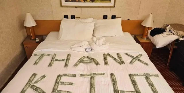 Пассажиры круизных лайнеров и пользователи соцсетей оживленно обсуждают нашумевшую фотографию с деньгами. На ней изображены купюры, разложенные на кровати в каюте в виде надписи "Thanx Ketut". Необычный способ оставить чаевые вызвал неоднозначную реакцию у пользователей. Об этом пишет New York Post.