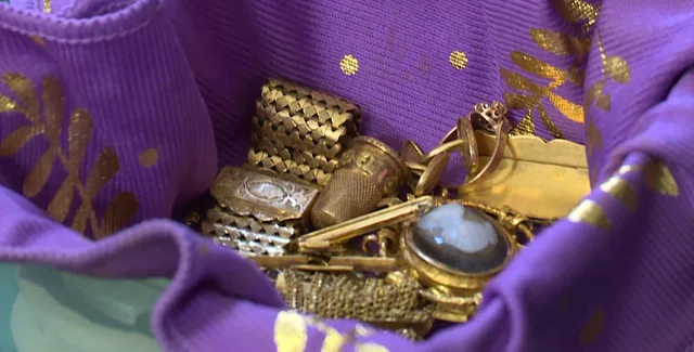 В тайнике также обнаружены золотые кольца, броши с жемчугом, браслеты, инкрустированные драгоценностями, а также заколки для волос. Драгоценности, видно, лежали под стеной длительное время и были запутаны среди корней старого дерева. До сих пор неизвестно, как, почему и когда они там оказались.