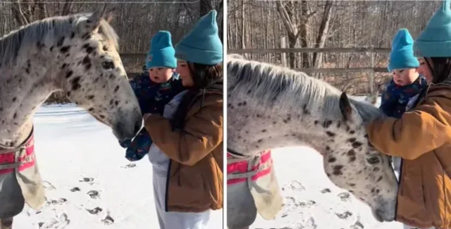 На видео Окли держит своего маленького сына на руках и подходит к животному, чтобы поприветствовать его. Однако реакция коня оказалась неожиданной: после короткого обнюхивания ребенка, Садс опустил голову к животу женщины и принялся тщательно его исследовать, а затем взглянул на нее пристально, будто пытаясь что-то сказать.