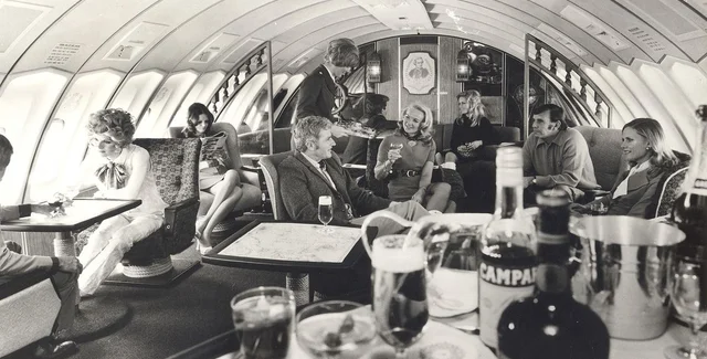 В 1970-х годах авиакомпании старались привлечь пассажиров не только низкими ценами. В полете предлагались различные развлечения. Танцполы, бары и пианино размещались прямо в салоне самолета.