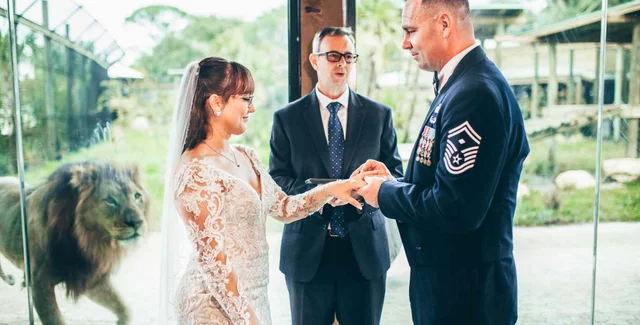 Во Флориде молодожены Тара и Томми Бирс обменялись клятвами не просто под открытым небом, а в самом сердце нового львиного вольера зоопарка Бреварда. Один из опасных животных даже заглянул на церемонию.
