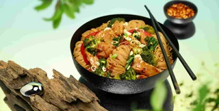 • жареная лапша с водорослями и веганским мясом из кактуса;