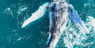 Горбатый кит (Megaptera novaeangliae) относится к подотряду "усатых китов". Животные этой группы могут достигать 16 метров в длину и весить до 35 тонн, а сами млекопитающие питаются планктоном, крилем и мелкой рыбой, процеживая воду через китовые усы.