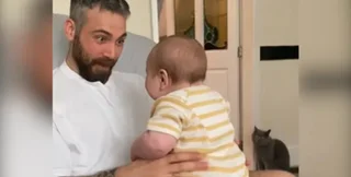 Молодая мама запечатлела на видео, как ее маленький сын Джин смеется, играя с папой, но настоящую славу в соцсетях получил вовсе не малыш. В углу кадра внимательные зрители заметили кота по кличке Бинкс с его недовольной мордочкой.