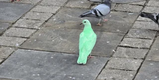 Несмотря на шутки в соцсетях о "радиоактивном" голубе или "птичьем Халке", эксперты считают несколько версий того, почему пернатый имеет такую окраску. В частности, редактор журнала Birdwatch Майк Алибон считает, что сначала голубь был белым, но, скорее всего, его покрасили в зеленый.