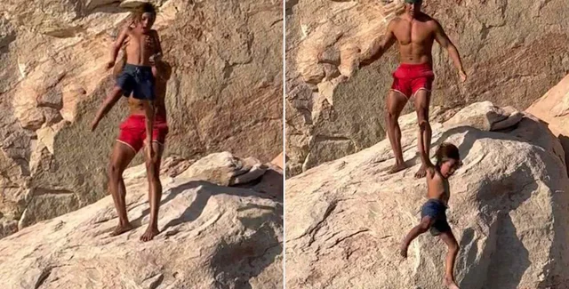 На видео Джи вместе с сыном Калиханом стоит на высокой скале над озером Пауэлл (США). Отец подбадривал мальчика, а затем поднял его и бросил в воду. После этого мужчина сам прыгает следом, а на поверхности встречает сына с улыбкой и жестом "палец вверх".