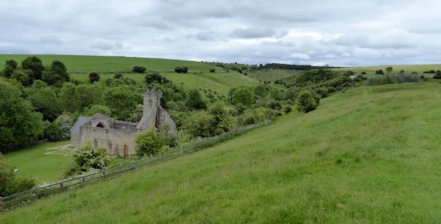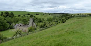 Чтобы добраться до него, нужно оставить авто и идти пешком — через луга, через заброшенную железную дорогу и вверх по известняковой тропе, пока не появятся остатки каменной церкви XII века. Вокруг — холмы, где когда-то стояли дома, ремесленные мастерские и два имения.