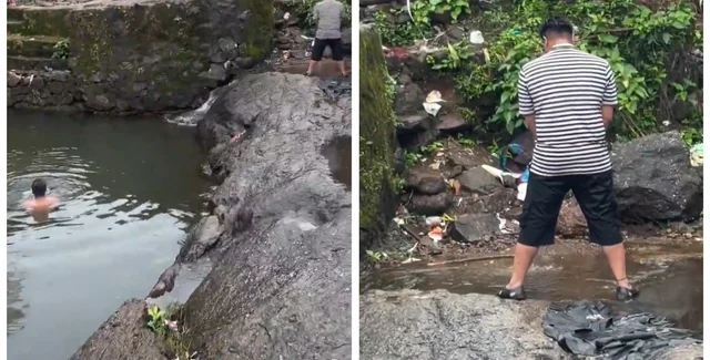 Ролик быстро стал вирусным — набрал более 700 тыс. просмотров и полторы сотни комментариев. На кадрах видно, как один мужчина плавает в потоке, а другой справляет нужду всего в нескольких метрах от него.